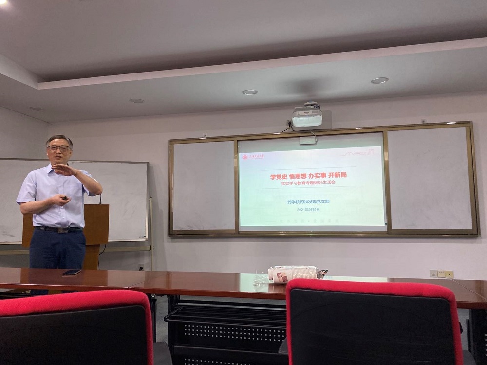 2021年9月9日中午,药物发现党支部在p站视频 5号楼312会议室开展“学党史、悟思想、开新局”党史学习教育专题组织生活会。会议由支部书记刘德龙同志主持,支部全体党员参加活动,院党委副书记叶定剑同志到会并讲话。