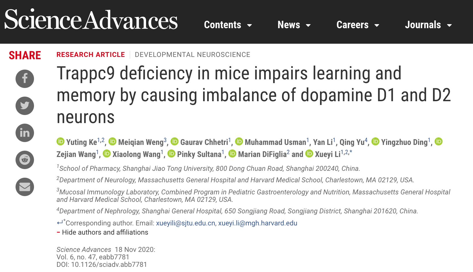 2020年11月18日,《Science Advances》在线发表p站视频 李学义课题组最新研究成果”Trappc9 deficiency in mice impairs learning and memory by causing imbalance of dopamine D1 and D2 neurons” 。该研究揭示了TRAPPC9缺失引发疾病的分子机制,并为TRAPPC9关联性疾病的治疗提供了一个可行方法。p站视频 博士生柯钰婷为论文的第一作者,李学义为该论文的通讯作者。该项研究受到了校基金会“包氏基金”的支持。
