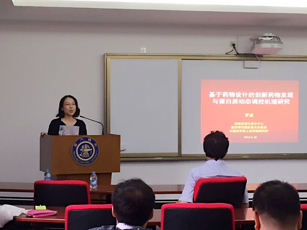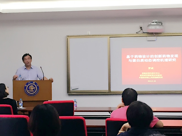 罗成研究员作了题为《基于药物设计的创新药物发现与蛋白质动态调控机理研究》的学术报告。详细介绍了他长期以药物设计为驱动力,在创新靶点的生物机制研究以及先导化合物的发现上面取得的科学发现。