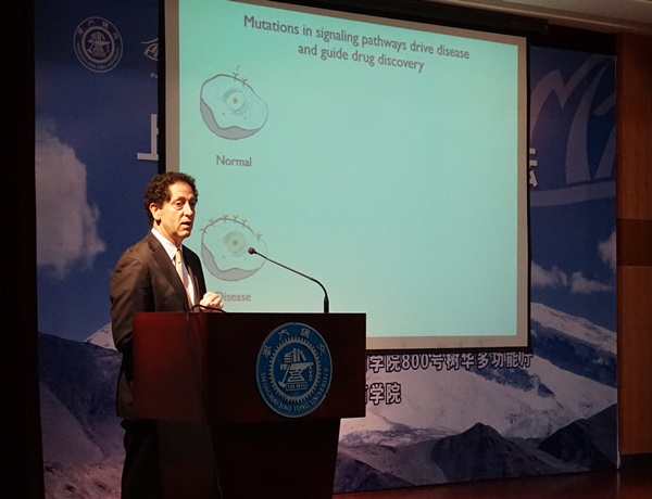 开幕式后,Shokat教授以“针对传统靶点的非传统新药开发策略”做了精彩的学术报告,向在场的师生们传授了他的新药研发宝贵经验。Shokat教授从他的研究经历入手,用新药研发的案例,深入剖析了如何综合运用化学和生物的工具解决新药研发中亟待解决的问题。