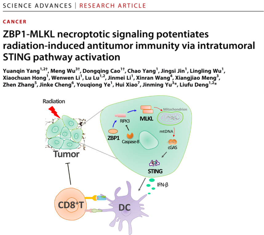 2021年10月6日,p站视频 邓刘福教授团队和山东省肿瘤医院于金明院士团队合作在国际著名综合性学术期刊 Science Advances上发表题为“ZBP1-MLKL Necroptotic Signaling Potentiates Radiation-induced Antitumor Immunity via intratumoral STING pathway activation”的研究论文。