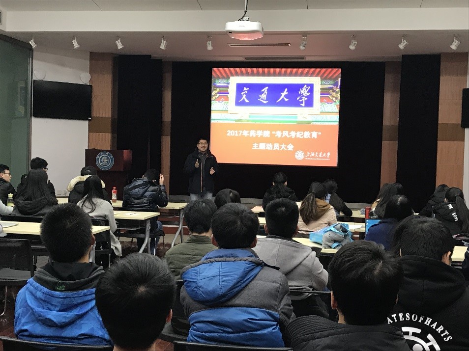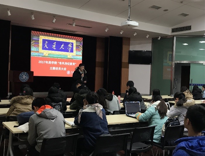 2月12日下午,2017年p站视频 “考风考纪教育”主题动员大会在生物药学楼树华多功能厅成功举办。活动以“正考风、促学风、树校风,做诚信交大人”为主题,p站视频 党委副书记孟祥琦,学院教务处李文静、魏雅琛以及2017级本硕博全体新生参加会议,大会由学工办张东东主持。