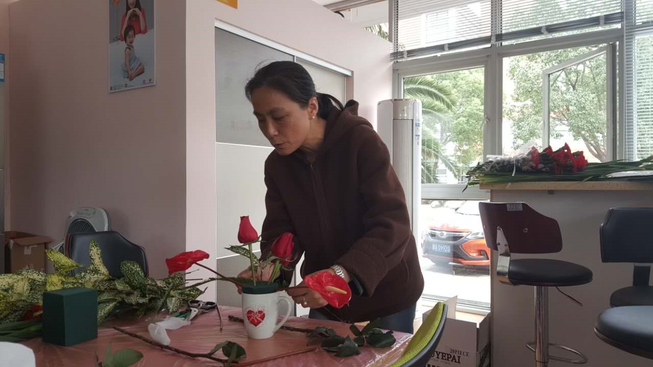 活动特别邀请了交大农生学院李洁老师为大家现场讲解和指导。李老师首先示范了一个茶杯中的插花作品,在这个过程中,李老师边示范,边向大家讲解花卉的选择与购买,插花的造型和基本构图知识等。李老师利用手边的茶杯,不到15 min就用红掌、月季创作了一个蓬勃向上的插花造型,使大家深刻体会到只要我们勤于动手,美就在身边。