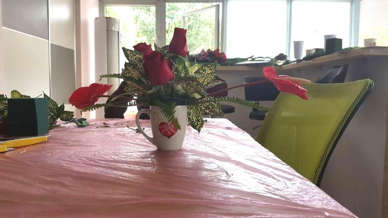 接着,在李老师的指导下,大家跃跃欲试,以高涨的热情投入到插花创作之中,唐菖蒲、香石竹、非洲菊和星点木,在老师们的手中飞舞着,跳动着,一个个作品融入了大家美丽的心情。