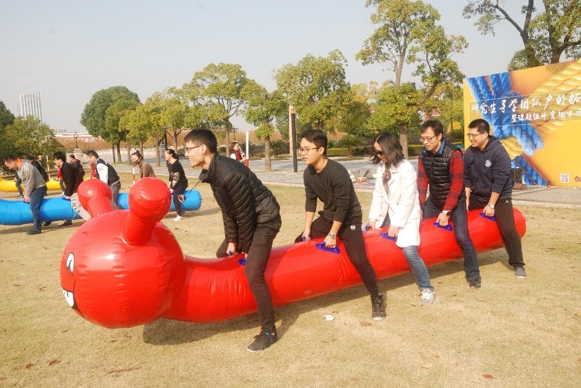 参加此次活动的团队共有4支,活动从持续了两个小时,包括同心鼓、能量传输(高山流水)、竞速毛毛虫等3个项目,每个项目分别有两轮练习和比赛。每个拓展对抗项目都需要通过团队协作的形式完成,老师和同学们通力合作,在练习中热烈讨论比赛策略总结经验,在赛场上展开团体间的竞争,齐心协力、全情投入,在拓展对抗中加深了了解,增强了感情,收获了欢声笑语与友谊,营造了轻松愉悦的氛围。比赛的同时,大家也不忘彼此照顾,发扬“友谊第一,比赛第二”的精神,充分体现了交大师生团结互助的精神。
