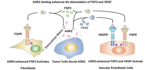 李大伟教授团队在观察裸鼠荷瘤实验中AGR2抗体18A4的抑制肿瘤效果时受到启发,猜测AGR2可能参与了肿瘤的血管形成。通过一系列科学严谨的细胞学实验验证,该团队发现AGR2蛋白能够促进血管内皮生长因子VEGF和碱性成纤维细胞生长因子FGF2的促血管形成活性。进一步的分子生物学研究表明,AGR2可以直接和VEGF、FGF2相结合,并能够通过促进VEGF和FGF2分子自身的二聚化的方式增加肿瘤局部环境中的活性VEGF和FGF2浓度,最终导致血管内皮细胞及成纤维细胞向肿瘤细胞周围的迁移和聚集,为肿瘤微环境的形成提供了有利条件。这一新作用机制的发现第一次将分泌型AGR2蛋白与肿瘤微环境中的蛋白信号网络联系了起来,揭示了AGR2在肿瘤信号传递网络中所扮演的角色,为基于AGR2的肿瘤治疗药物的开发提供了科学的理论指导。
