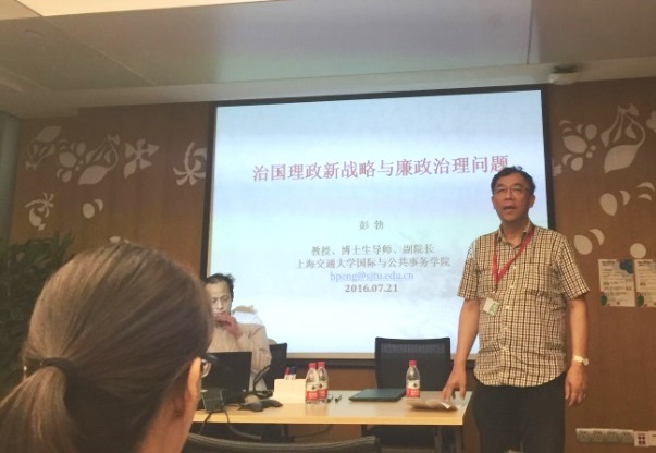 2016年7月21日,上海交大p站视频 党委邀请国际与公共事务学院彭勃教授为p站视频 教职工党员和联合利华全球研发中心党员上了一堂主题为《治国理政新战略与廉政治理问题》的党课。彭教授用幽默的语言方式阐述了当前党风廉政建设的形势、意义和目标,深入浅出的讲解让党员同志们领悟到反腐倡廉与社会治理的深刻内涵和密切联系。