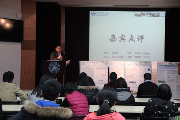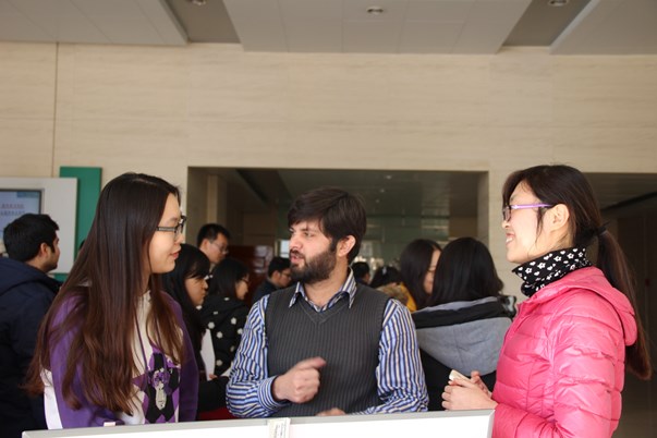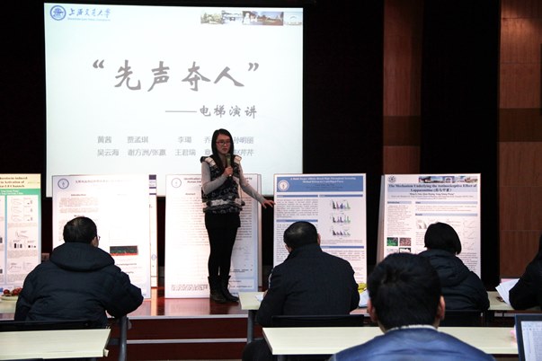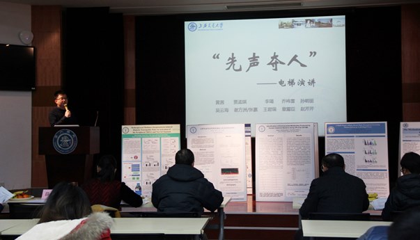 在海报展板展示部分,11位同学先进行一分钟的电梯演讲,简要介绍其海报内容,随后进入自由交流和评委点评环节。在活动现场,大家自由交流,相互学习,碰撞着思维的火花,点燃了创新的激情。此次活动还吸引了不少留学生前来,使同学们在相互沟通的过程中既增长了学识,又增进了友谊。