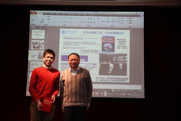 经评委点评和打分,最终王飞虎同学以其“肿瘤靶向和刺激相应性的纳米药物治疗原位肿瘤及其转移”的精彩报告荣获特等奖,张仟鹏、徐佳同学荣获一等奖,齐震、许蒙、黄道伟、杨小玉同学获二等奖,陈培清等同学获三等奖。在海报展示中,赵芹芹、孙明丽同学荣获最具人气海报奖,黄茜等同学获得最具潜力海报奖,章鹭臣等同学获得优秀海报奖。