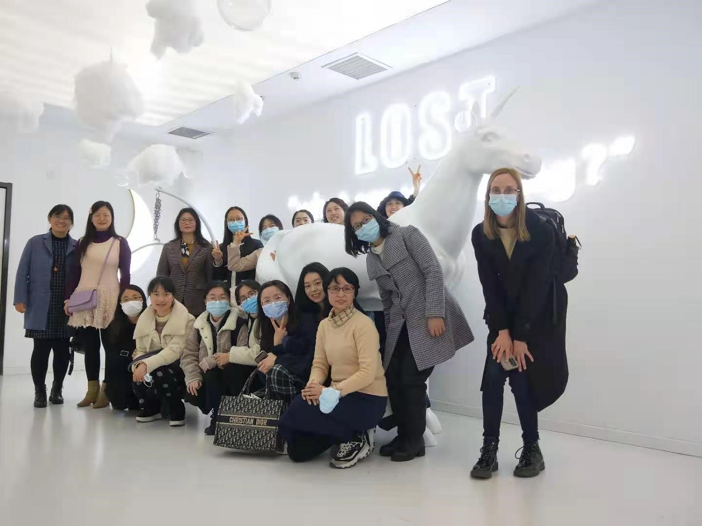 场馆入口处是一个洁白无瑕的空间,在一片白色柔和的灯光下是雪白俊美的独角兽,推开第一个展厅大门,大家就被五彩斑斓的水母吸引,关上房门,黑暗中仿佛置身于无限的深海中。第二个展厅中错落有致地悬挂了缤纷的灯盏,持续变幻着色彩,感叹之余,老师们纷纷用手机记录下了自己在这迷离的幻境中的身影。